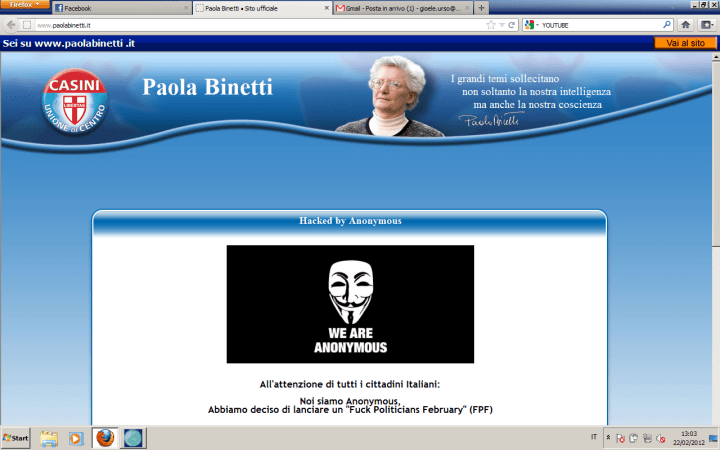 #SocialMediaNewsAnonymous attacca il sito di Paola Binetti Condividi: Condividi su X (Si apre in una nuova finestra) X Condividi su Facebook (Si apre in una nuova finestra) Facebook Mi piace Caricamento... Correlati