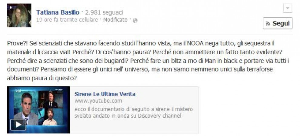Quindi la domanda è: perché se qualcuno dice che esistono gli alieni e i fantasmi nessuno si indigna, mentre scoppia il putiferio se qualcuno sostiene che esistono le sirene?