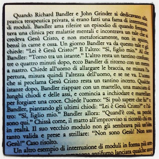 “Bandler ama riferire un episodio di quando frequentava una clinica per malattie mentali e incontrava un tale che si credeva Gesù Cristo, e non metaforicamente, non in spirito, bensì in carne e ossa. Un giorno Bandler va da questo tale e gli chiede: “Lei è Gesù Cristo?”. E l’altro: “Si, figlio mio”. Al che Bandler: “Torno tra un istante”. L’altro resta un tantino confuso; tre o quattro minuti dopo, ecco Bandler di ritorno con un metro a nastro. Chiede all’uomo di allargare le braccia, ne misura l’apertura, misura quindi l’altezza dell’uomo, e se ne va. L’uomo che si proclama Gesù Cristo resta un tantino incerto. Qualche istante dopo, Bandler riappare con un martello, una manciata di lunghi chiodi e delle assi, e incomincia a inchiodare e martellare per forgiare una croce. Chiede l’uomo: “Si può sapere che fa?” e Bandler piantando gli ultimi chiodi: “Lei è Gesù Cristo?” e l’altro: “Sì, figlio mio”. Bandler allora: “Quand’è così, sa perché sono qui”. Chissà come, il matto all’improvviso si ricordò chi era in realtà. Il suo vecchio modulo non gli sembrava più un’idea tanto valida e cominciò a strillare: “Non sono Gesù, non sono Gesù!”. Caso risolto“.