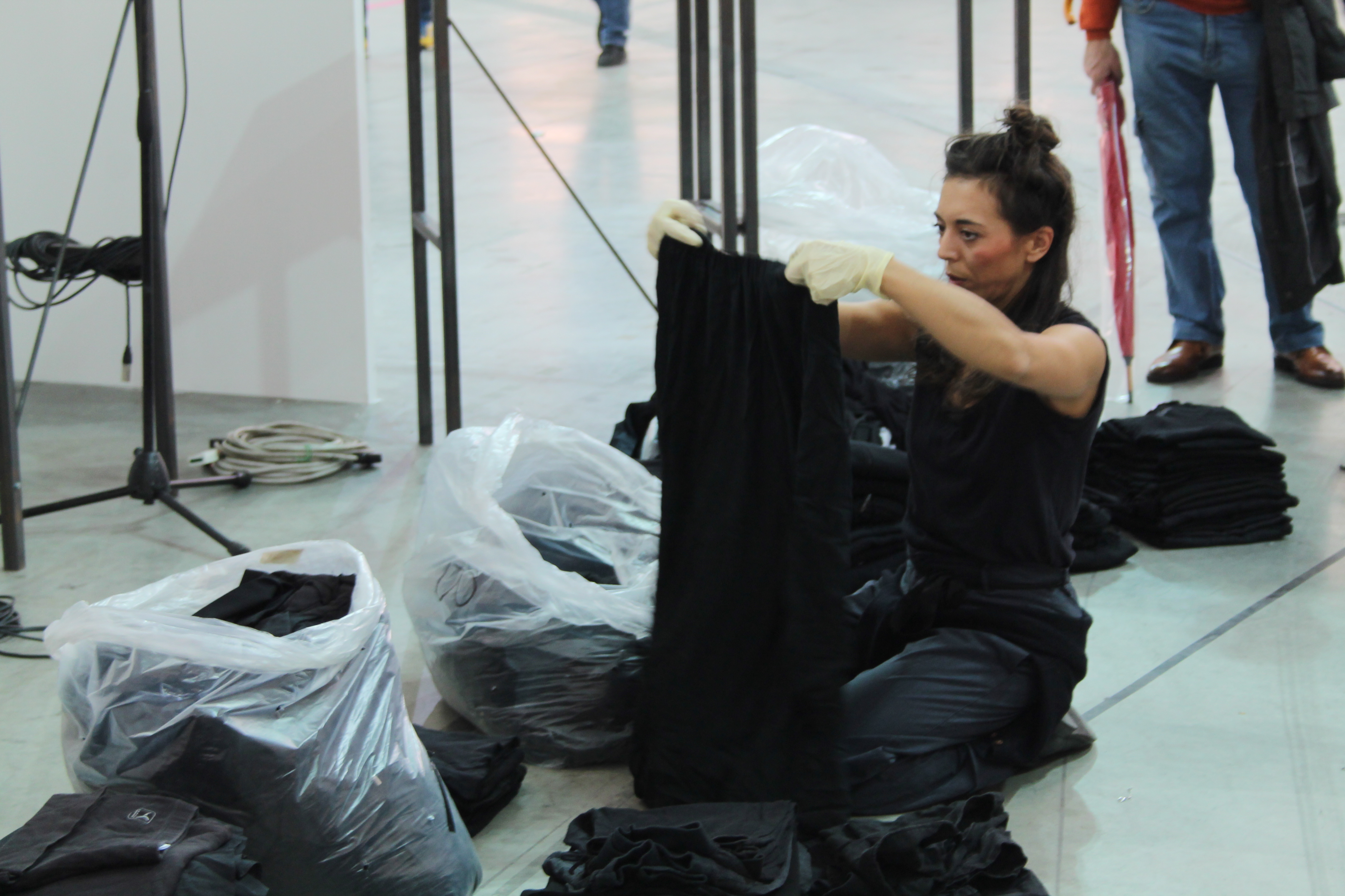 Pochi metri dopo ecco il reparto abbigliamento dark. Pantaloni neri, gonne nere, giacche nere, maglie nere, camicie nere. Tutte rigorosamente impilate da due signorine che con i mucchi andavano a comporre un lungo cerchio che pochi minuti dopo sarebbe stato il palco di un’esibizione. Che non ho capito, ma una mia amica mi ha spiegato puntualmente.