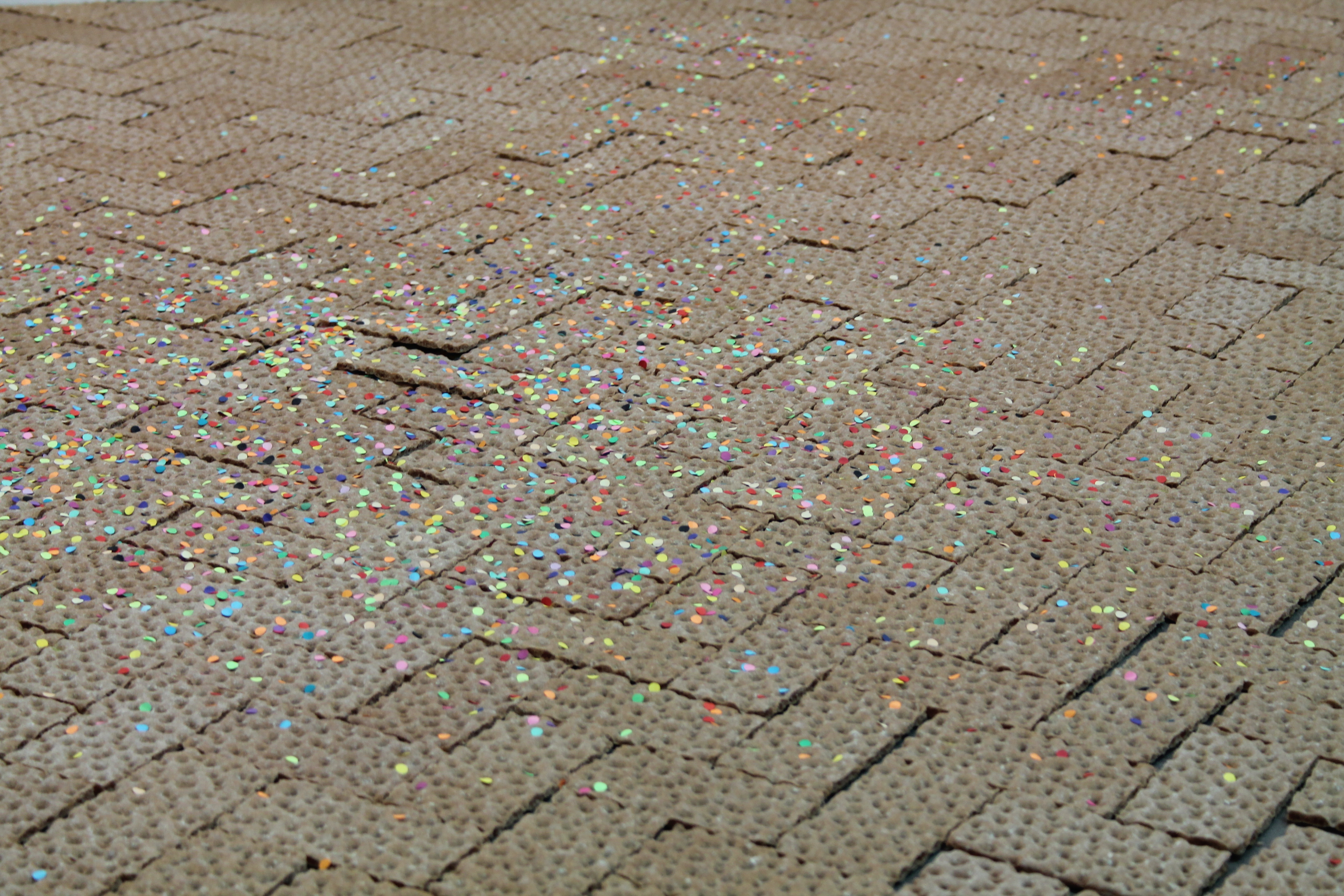 In uno dei corridoi laterali ecco il reparto alimentari d’arredo. Qui nella foto un tappeto composto da crackers, visto il colore penso integrali, con inserti di coriandoli verso il centro. Un pezzo imperdibile per i vostri saloni, ma sconsigliato se con voi vive un cane o un gatto. Ve lo potrebbe mangiare.