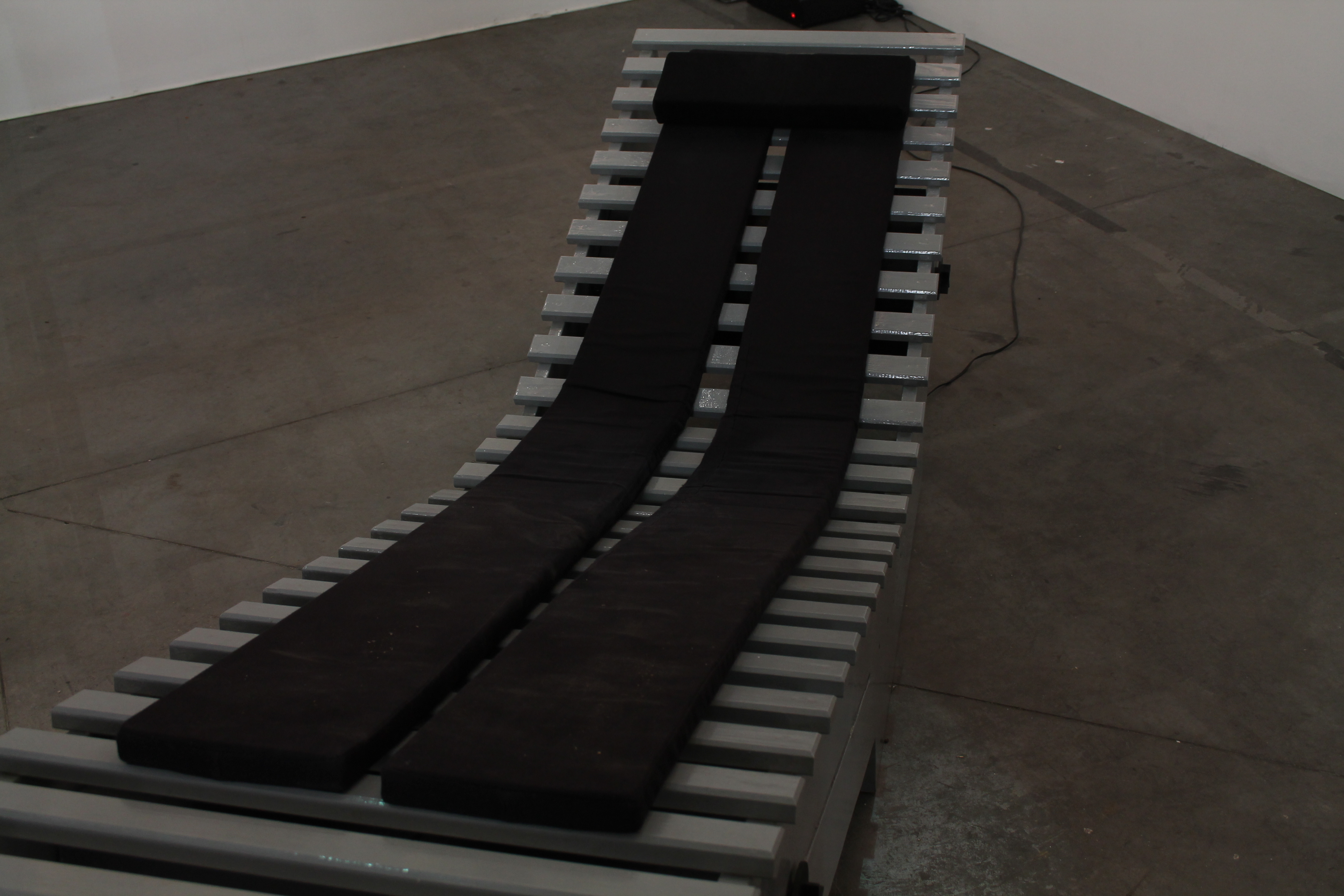 Gira che ti rigira sono arrivato al reparto delle chaise longue. Nella foto potete apprezzarne una delle più semplici in mostra, ma anche delle più eleganti a mio avviso. Forse un po’ scomodo il taglio centrale dell’imbottitura, ma la bellezza ha indubbiamente i suoi svantaggi.