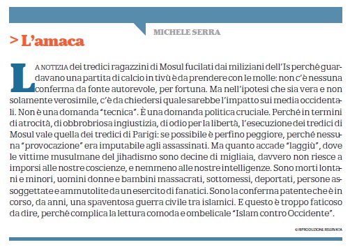 Il giorno dopo, ovvero ieri, un secondo alert di Michele Serra all’interno de L’Amaca pubblicata su La Repubblica. Serra scrive: “La notizia dei tredici ragazzini di Mosul fucilati dai miliziani dell’IS perché guardavano una partita di calcio in tivù è da prendere con le molle: non c’è nessuna conferma autorevole, per fortuna. Ma nell’ipotesi che sia vera e non solamente verosimile…“. L’editorialista di Repubblica ci dice due cose: 1) la notizia non è verificata; 2) la notizia è verosimile.