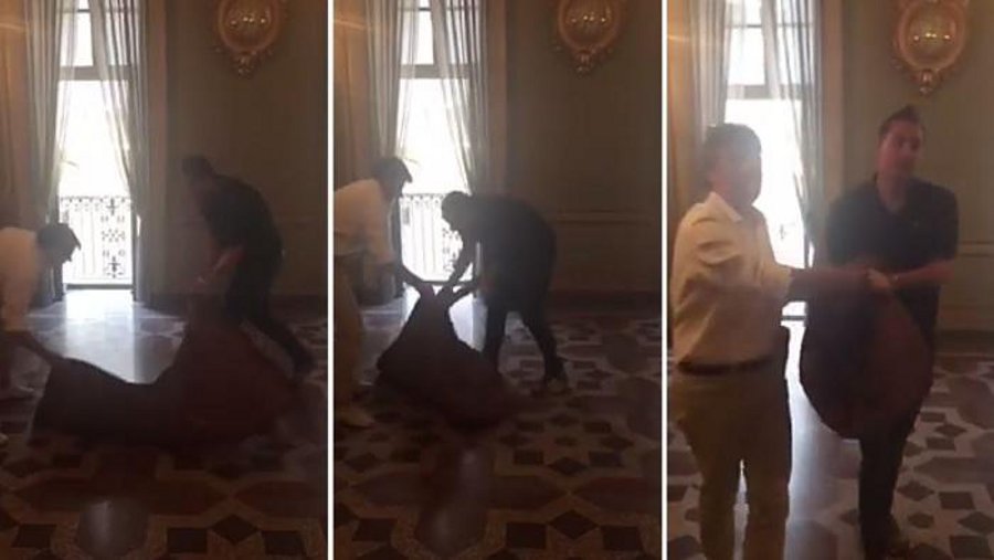 Quatti quatti, tranqulli tranquilli, si recano fino alla sala dedicata per quel giorno alla preghiera e a favore di telecamera danno via al blitz. Che poi un blitz non è perché prima di entrare uno dei due si fa riprendere e spiega il motivo dell’azione, un vigile piazzato davanti alla porta li guarda, poi entrano con una calma che nemmeno in un giorno di saldi in via Roma, ripiegano per bene il tappeto, fanno per portarlo via e quando vengono caziati da uno del Comune accennano un “ma dai…..” e mollano il malloppo!