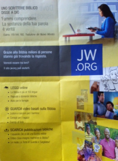 Partiamo dal contenuto del volantino. “Dove si trova la risposta ai grandi interrogativi della vita” è il titolo della pubblicazione e viene abbinato a un’immagine di copertina che richiama a un uso su smartphone dei contenuti religiosi della comunità.