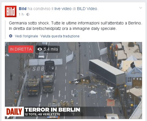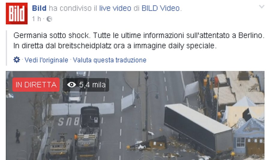 Un esempio? La Bild, uno dei più grandi quotidiani tedeschi, poco dopo l’attentato trasmetteva una lunga diretta sulla propria pagina Facebook direttamente dal luogo dell’attentato. I quasi 2 milioni e 200 mila fan di quella pagina hanno potuto vedere sul proprio cellulare il camion schiantato contro le casette di Natale e i soccorsi ai feriti.