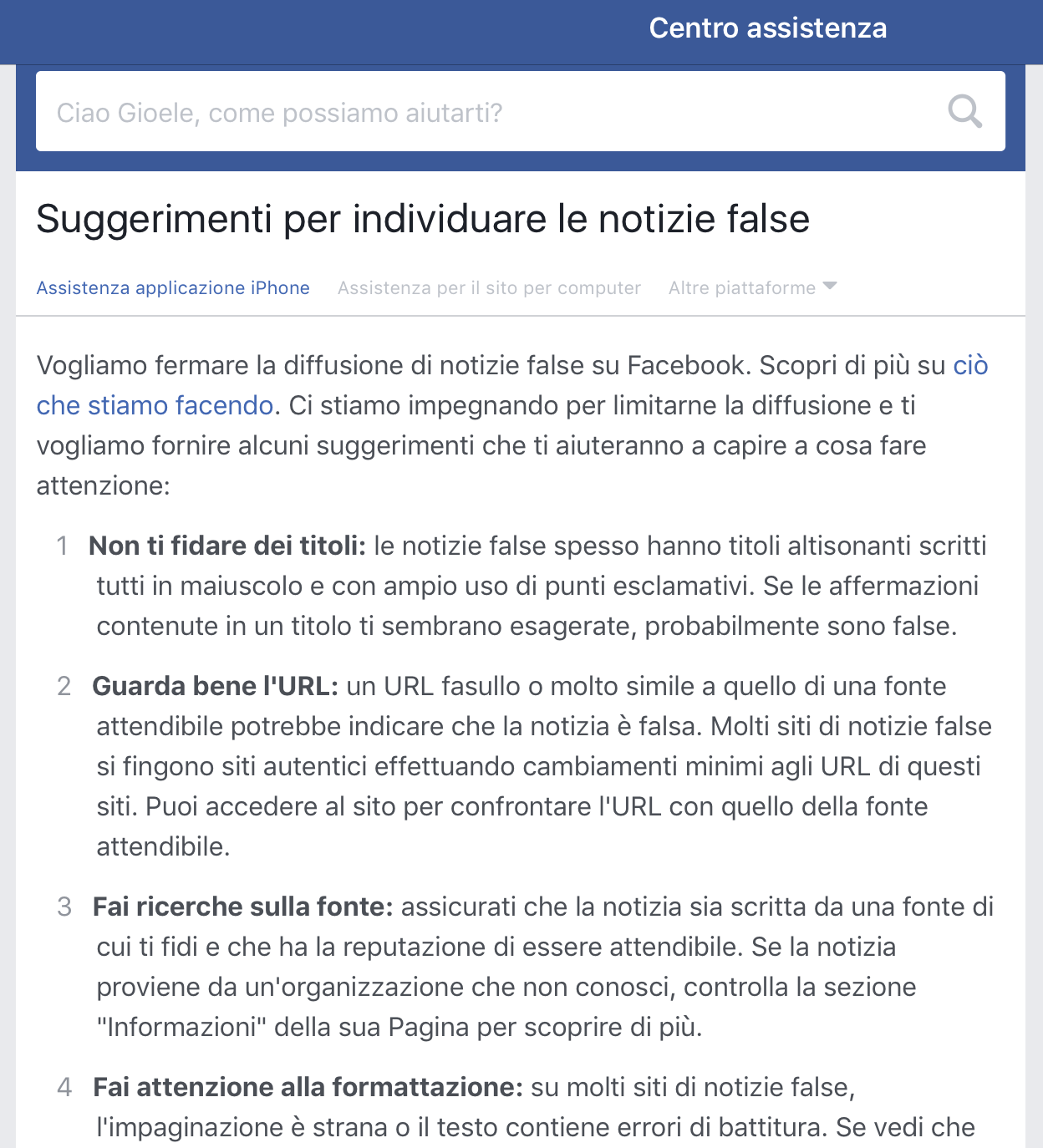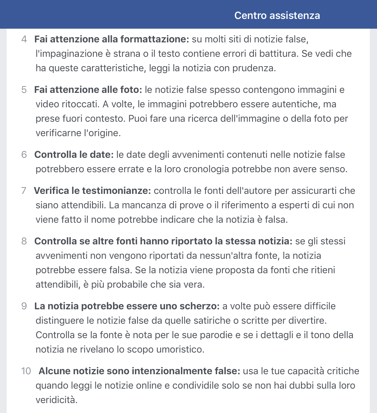 Molti di voi in questi giorni si saranno trovati davanti a un messaggio del social network che iniziava così: “Vogliamo fermare la diffusione di notizie false su Facebook. Ci stiamo impegnando per limitarne la diffusione e ti vogliamo fornire alcuni suggerimenti che ti aiuteranno a capire a cosa fare attenzione“. E poi parte il decalogo a prova di analfabeta funzionale.