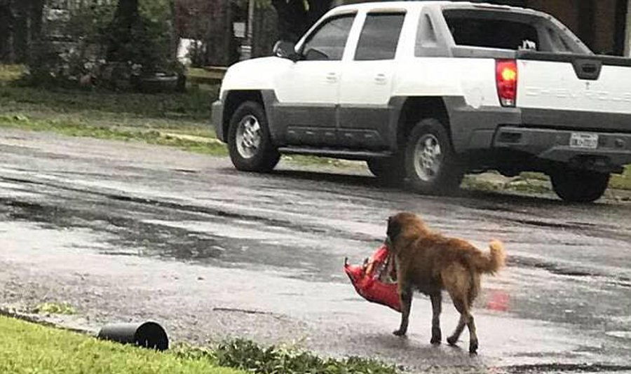 La foto ritrae il quattro zampe mentre sta zampettando per strada con in bocca ben saldo il suo sacchetto di crocchette. Sì, stava cercando riparo e si stava portando dietro il cibo. Cosa ci insegna questo scatto?