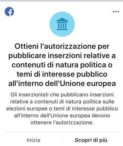 Vita dura per chi vorrà tentare di condizionare su Facebook le prossime elezioni europee. Da oggi chiunque vorrà pubblicare inserzioni relative a contenuti di natura politica o di interesse pubblico all’interno dell’Unione europea dovrà chiedere un’autorizzazione al social network.