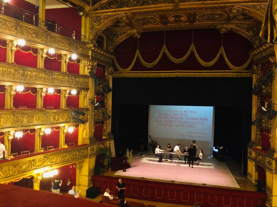 Palco 36, Teatro Carignano a Torino. Ieri sera, sabato 1 agosto, per assistere a Kollaps per la regia di Marco Lorenzi. Di questa stagione estiva è lo spettacolo più bello al quale ho assistito. Senza nulla togliere però a Locke di Filippo Dini.