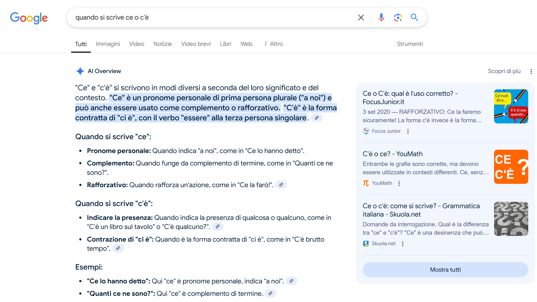 Se per esempio chiedevi al motore di ricerca ‘quando si scrive ce o c’è’, la risposta suggerita era un link a una pagina di Wikipedia, Treccani, articoli di giornale o portali specializzati. Oggi non è più così perché Google in svariati casi come prima risposta presenta quella generata da Gemini, la propria intelligenza artificiale.